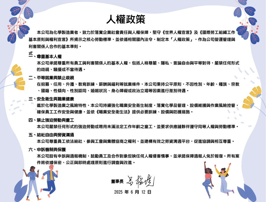 | Social Responsibility | Management Department | Implementing labor-management relations, focusing on employee occupational health and safety, and promoting social welfare activities. |
